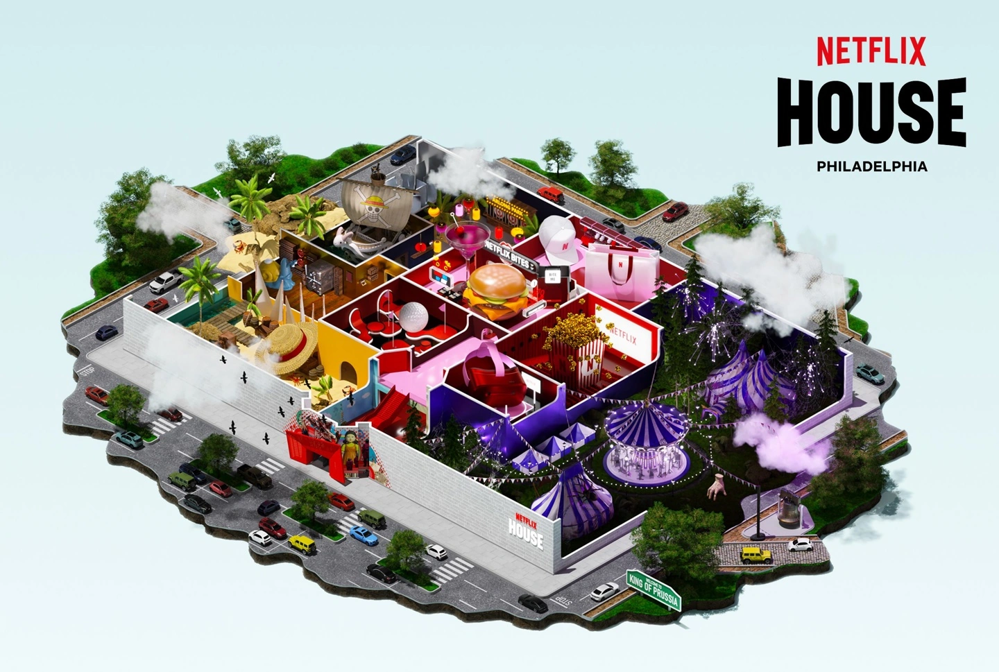 Netflix House 最早于 2023 年末对外公布,并确认首两家门店将落户美国 —— 一家设在费城郊外的 King of Prussia 购物中心,另一家位于得克萨斯州达拉斯的 Galleria Dallas 购物中心,两者都将进驻原有百货商店的空置店面。